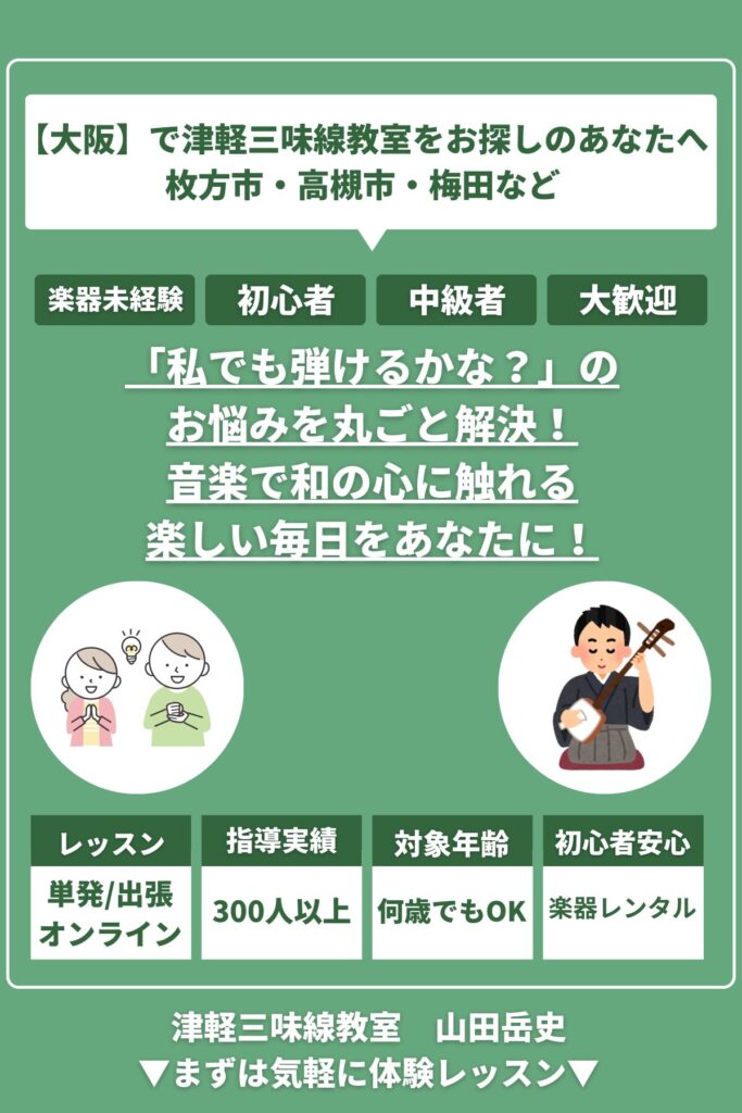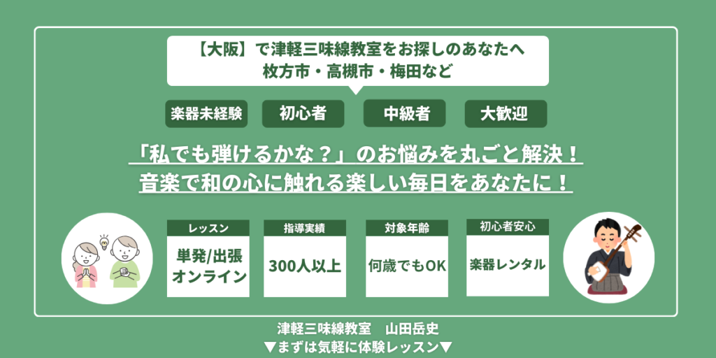 そんな方に向け、音楽教室を運営する筆者の立場で、三味線・津軽三味線教室選びのポイント、枚方市の三味線教室・津軽三味線教室についてご紹介していきます。